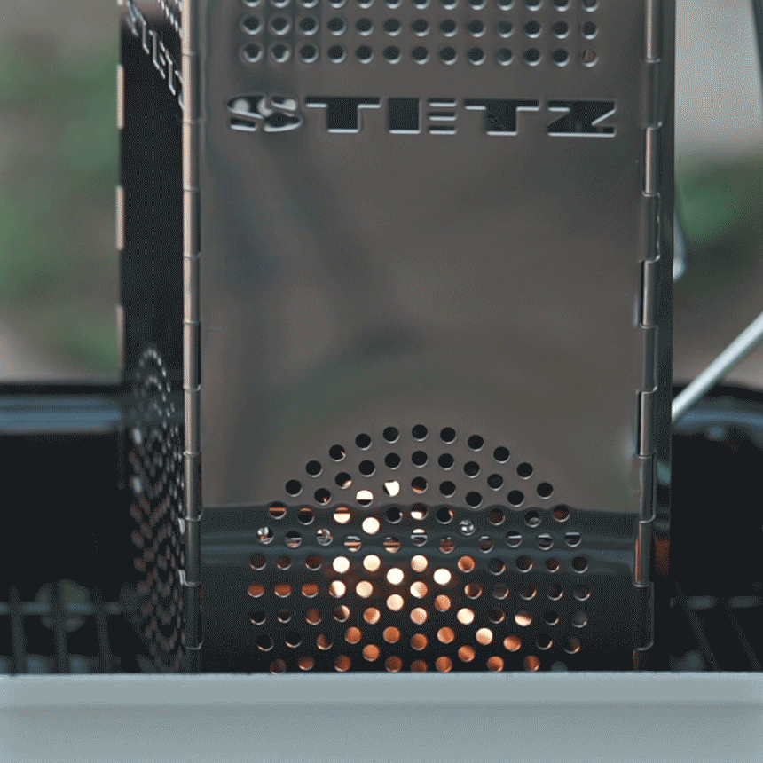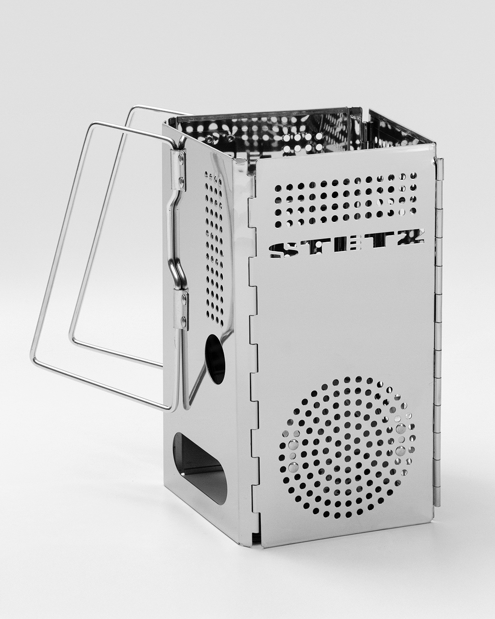 그 질문은 새로운 방향을 제시했다. 점화 과정에서의 짧은 시간조차 하나의 경험으로 확장시키는 것. 단순히 숯에 불을 붙이는 도구가 아니라, 그 순간을 바라보며 ‘불멍’을 즐길 수 있는 오브제로 재해석하는 것이었다. 그렇게 탄생한 디자인이 바로 클래식 스피커를 연상시키는 레트로한 형태의 접이식 침니스타터다. 익숙하면서도 새로운 타공 모양은 캠핑이라는 자연 속 환경과 묘하게 어우러지며, 기능과 감성을 동시에 만족시키는 균형점을 만들어냈다.